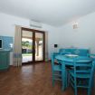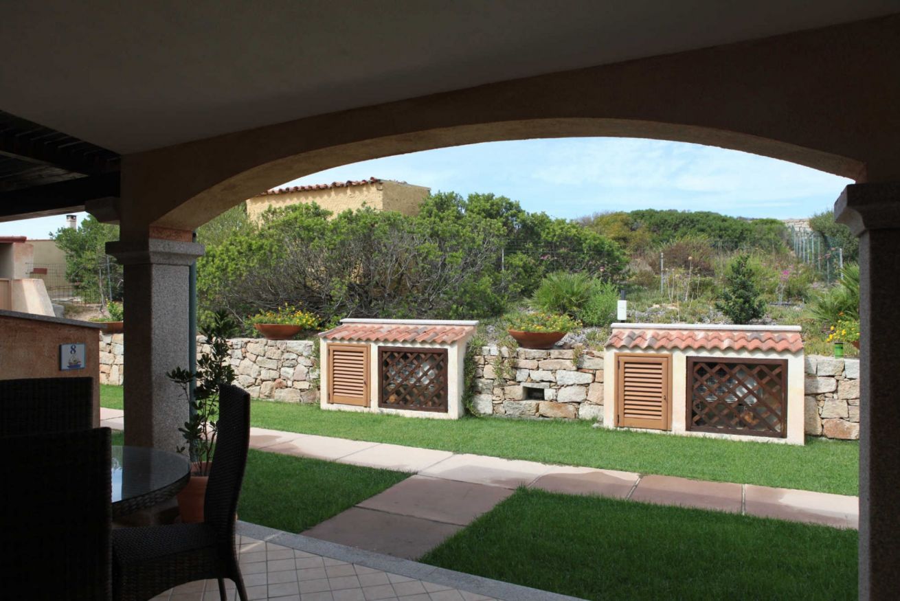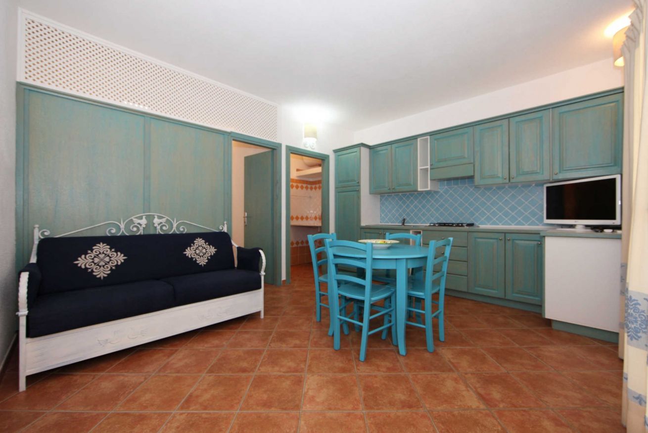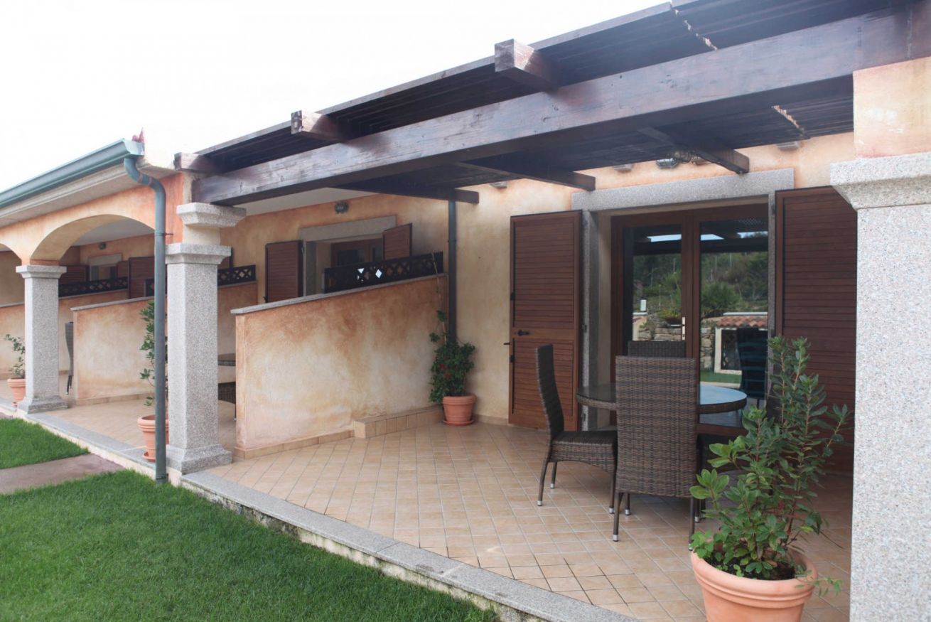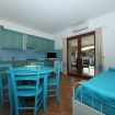 Terraced apartments with garden view feature a covered veranda furnished with deck chairs, a table, and rattan chairs. The interior consists of a living area with a kitchenette and a sofa bed (double or bunk bed, depending on the unit), a double bedroom with an electrically adjustable Velux window, and a bathroom with a shower box. They comfortably accommodate up to three people.