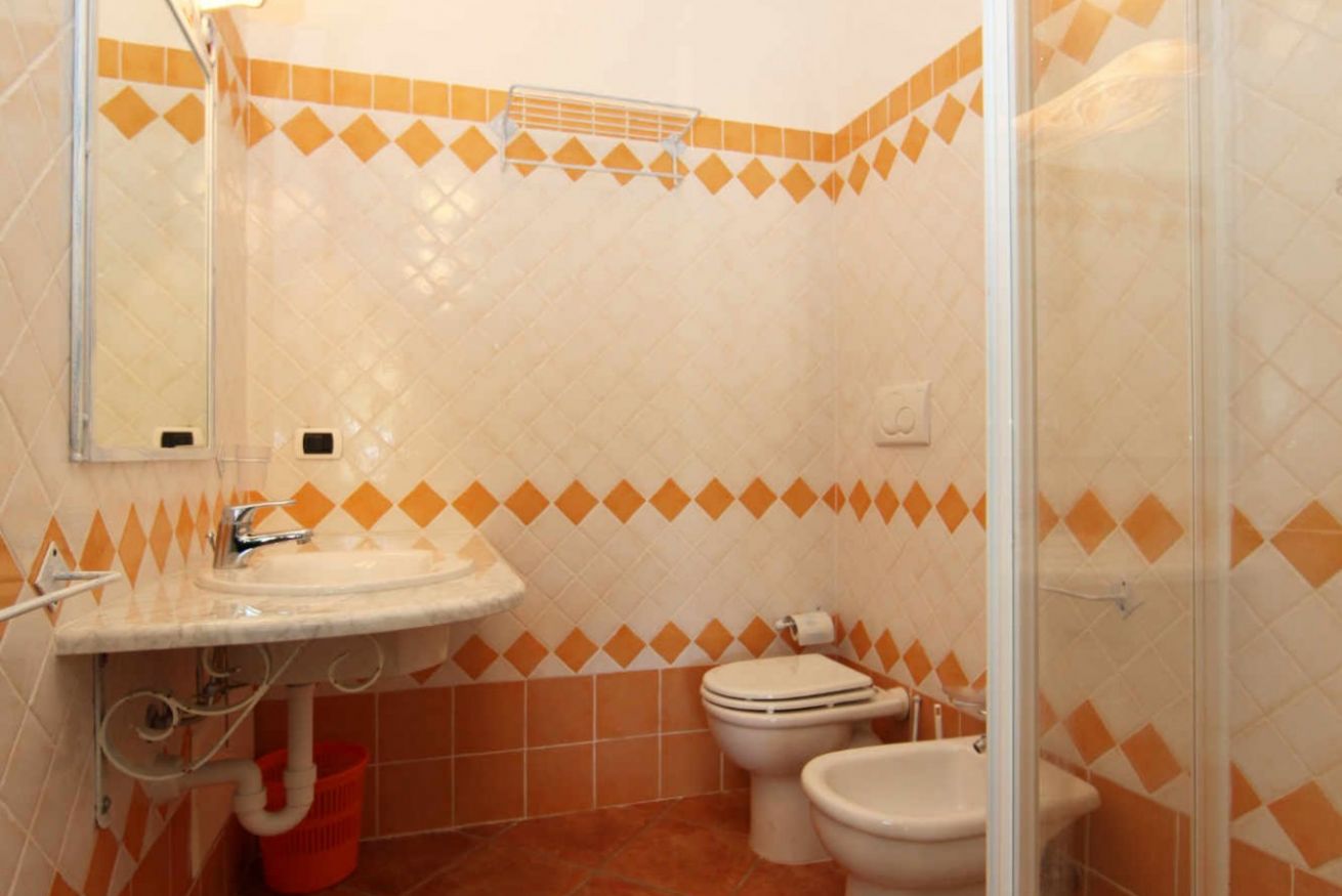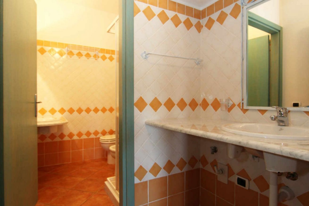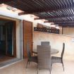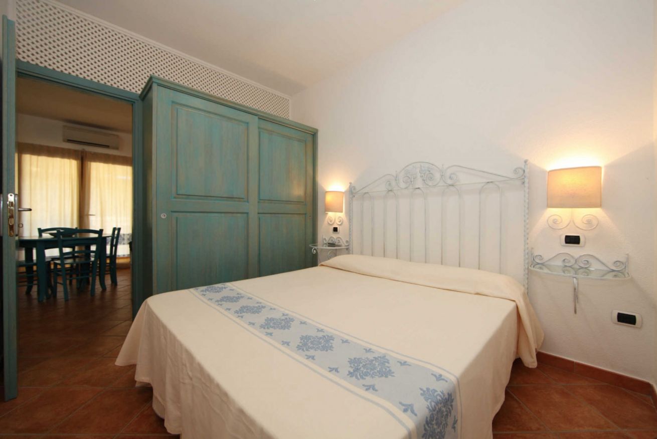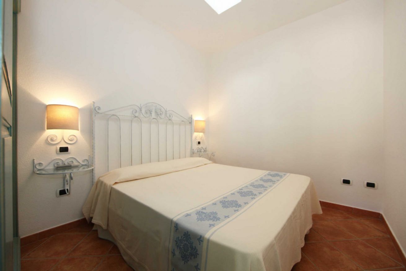 Terraced apartments with garden view feature a covered veranda furnished with deck chairs, a table, and rattan chairs. The interior consists of a living area with a kitchenette and a sofa bed (double or bunk bed, depending on the unit), a double bedroom with an electrically adjustable Velux window, and a bathroom with a shower box. They comfortably accommodate up to three people.